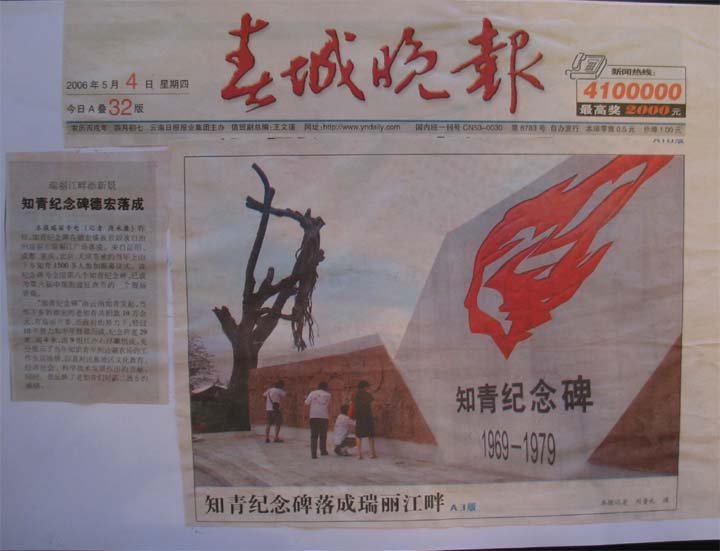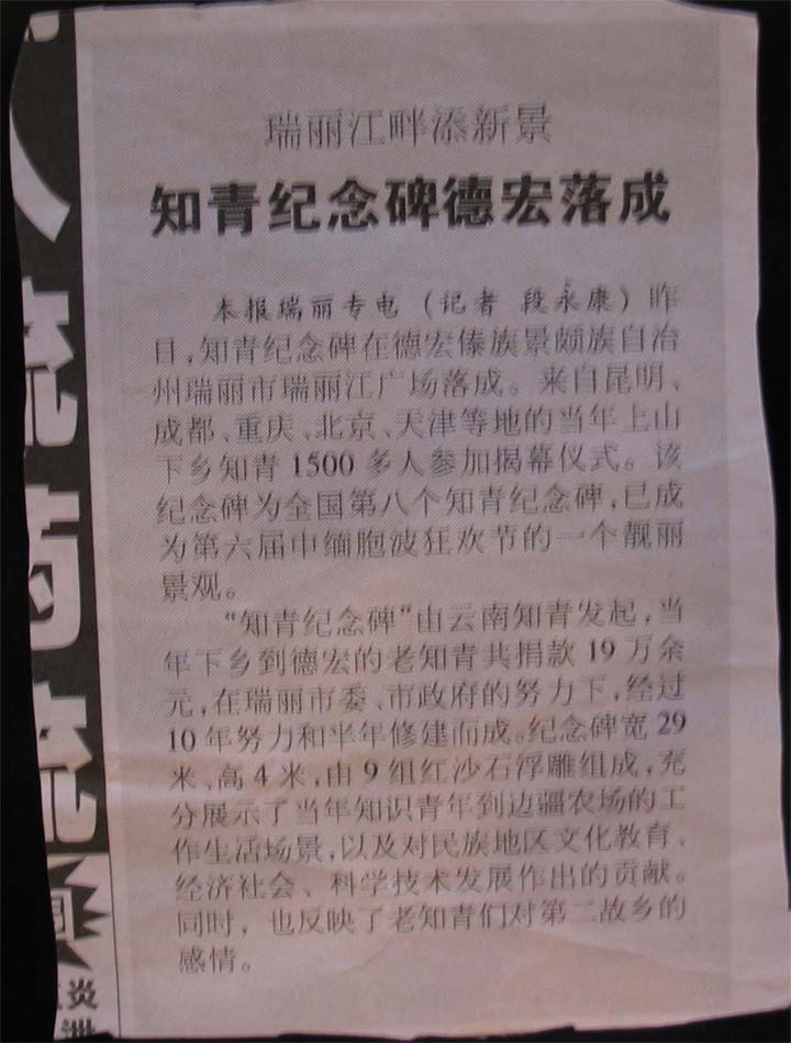 | 2006年5月3日,在中缅边境口岸——瑞丽, 隆重举行了知青纪念碑落成揭幕仪式。1500多人参加了剪彩庆典。从1996年4月份发起筹资、策划,前后历时10年,经历许多艰辛。 | |
