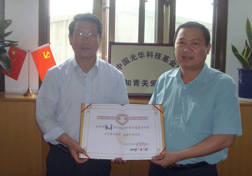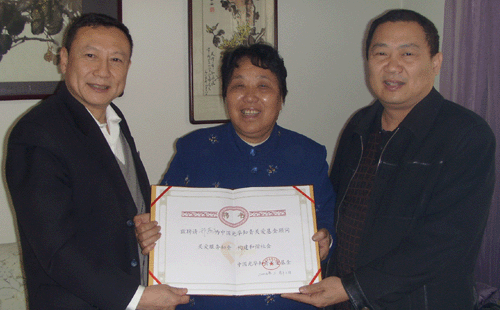 刘季平秘书长向邢燕子颁发基金顾问证书,并与常务理事周秉和合影 |