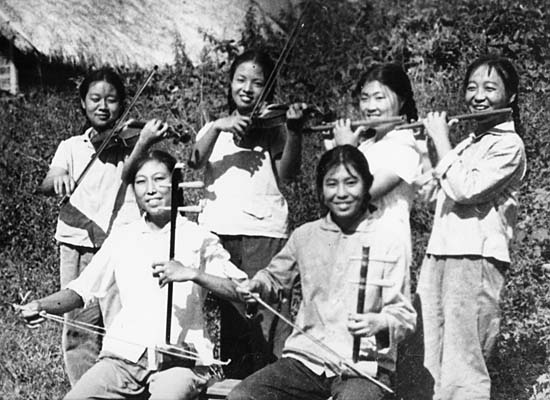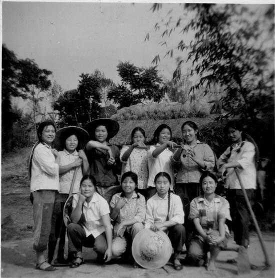 潞西遮放广弄寨知青何亚玲、黄丹梅、杨枝、吴粟、张敏等摄于知青茅屋旁(1971年)(照片提供:亚玲)